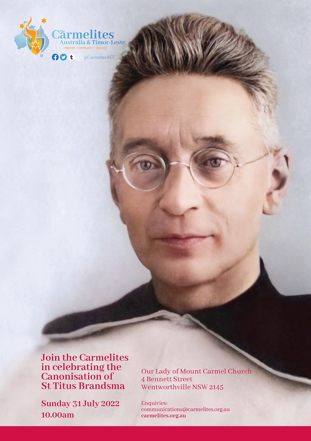 Everyone is invited to join us for our Mass of Thanksgiving for the Canonisation of St Titus on Sunday 31 July at 10:00 am. Masses of Thanksgiving are being celebrated in every parish within the Carmelite Province of Australia and Timor-Leste.